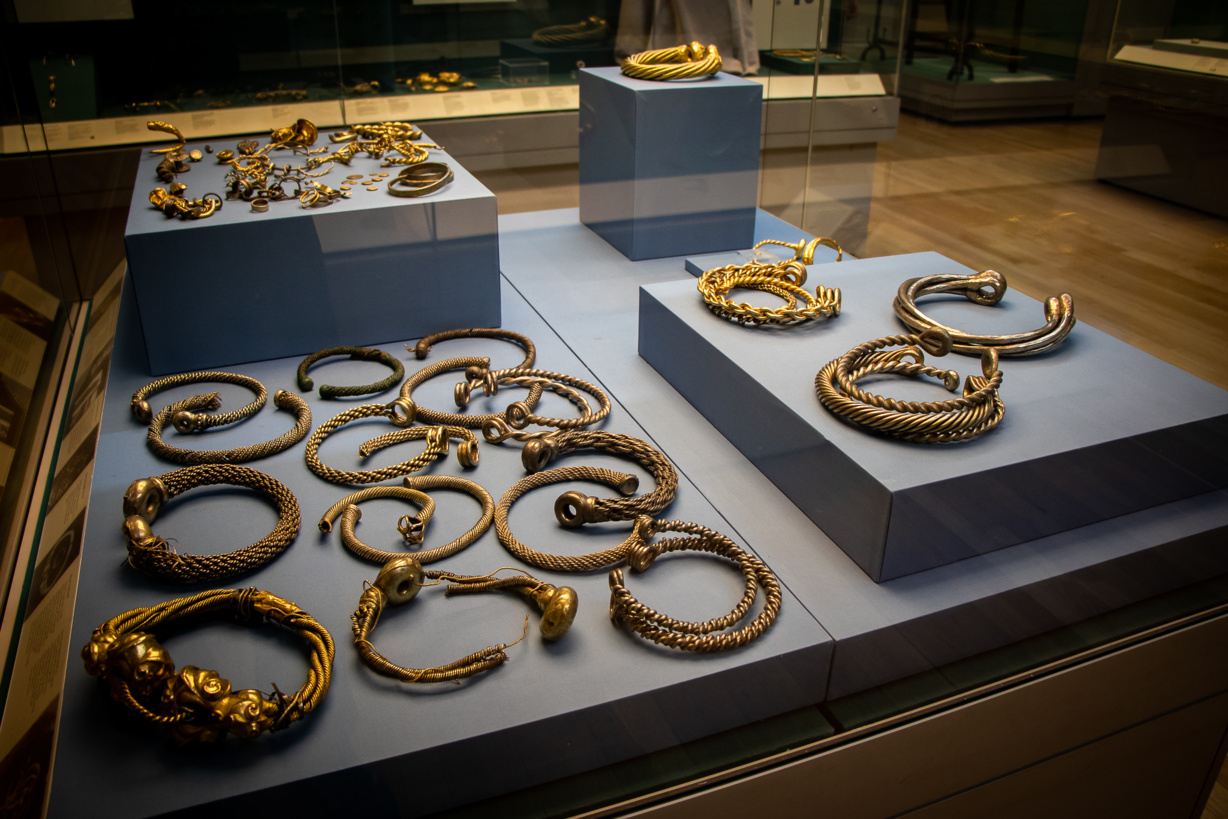 گنجینههای طلا و جواهرات متعلق به اقوام سلتیک در بریتانیا، از جمله دستبندها، کمربندهای طلایی، سنجاقهای زینتی و سکههای نفیس، نمونهای از هنر پیچیده و مهارت بینظیر فلزکاری این تمدن کهن هستند. این آثار نهتنها زیبایی و دقت در طراحی را نشان میدهند، بلکه اطلاعات ارزشمندی درباره نظام اجتماعی، تجارت و باورهای مذهبی سلتیها ارائه میکنند.