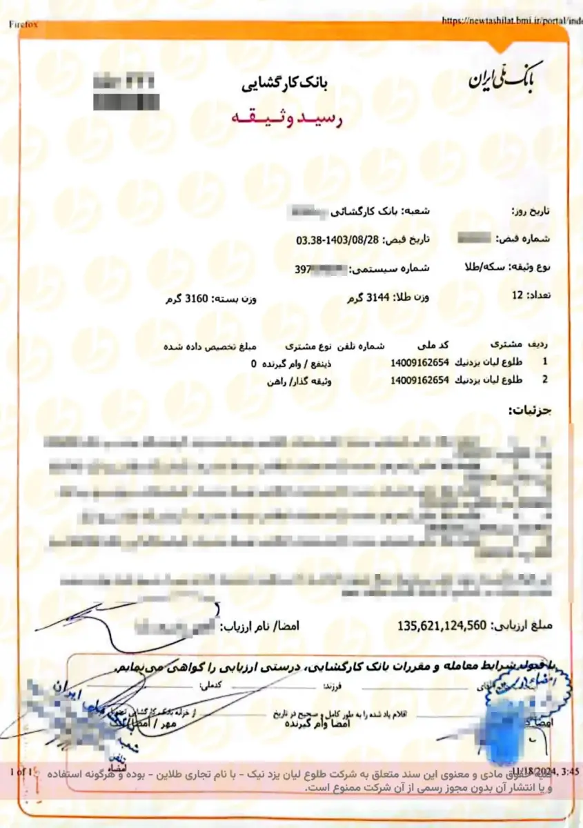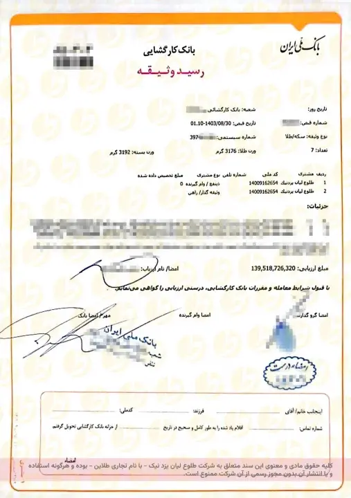 در این بخش، شما میتوانید تصویر نمونهای از رسید وثیقهای که طلاین در بانک کارگشایی بهعنوان گواهی تأییدیه برای ذخیرهسازی و نگهداری طلا ارائه میدهد، مشاهده کنید. این رسید، تأیید میکند که طلاهایی که از طریق سامانه طلاین خریداری شدهاند، در خزانه بانک کارگشایی با دقت و امنیت کامل نگهداری میشوند. هر رسید شامل اطلاعات دقیق درباره نوع، وزن، عیار و مقدار طلای امانتگذاریشده است و شفافیت کامل در فرآیند انتقال و ذخیرهسازی طلا را برای کاربران تضمین میکند.