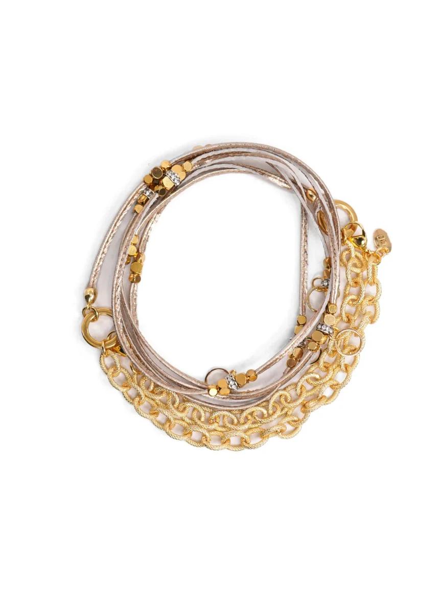 یکی از ویژگیهای اصلی لایهبندی ماکسیمالیستی، ترکیب جسورانه فلزات و مواد مختلف است. ترکیب طلا با نقره، یا ترکیب چرم، مهرهها و سنگهای قیمتی با فلزات سنتی گرانبها، زیباییشناسی منحصر به فرد و شخصی ایجاد میکند. این حالت اجازه میدهد که افراد از طریق انتخاب جواهرات خود خلاقیت و فردیتشان را بیان کنند و امکانات بیپایانی برای ابراز خود فراهم میآورد. تأثیر کلی این ترند ظاهری تازه و پیشرو است که همزمان با شکوه، حس آزادی و شادی را در بر دارد.