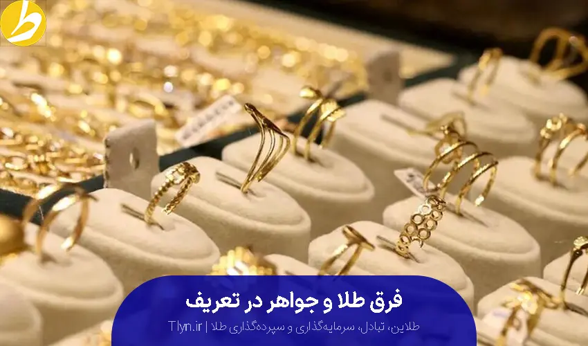 طلا و جواهر هر دو مصنوعاتی ساخته شده از فلز ارزشمند طلا هستند. تفاوت این دو در این است که جواهرات با انواع سنگهای قیمتی و نیمه قیمتی تزئین میشوند. غیر از فرق طلا و جواهر به لحاظ ظاهری، این دو در خرید، فروش، سود فروشنده و اجرت ساخت هم با هم تفاوتهایی دارند. اجرت ساخت جواهرات نسبت به طلا بیشتر است. در خرید و فروش هم بهدلیل اینکه در جواهرات سنگ و نگین بهکار میرود، ارزش آنها هم در فاکتور خرید و فروش محاسبه میشود. همچنین