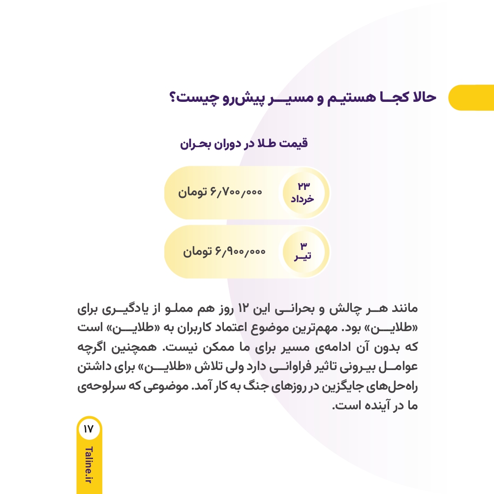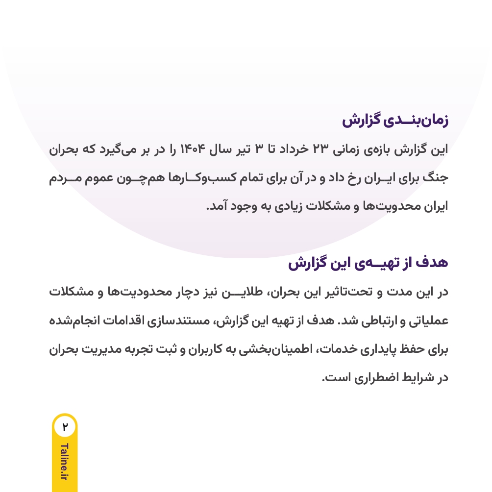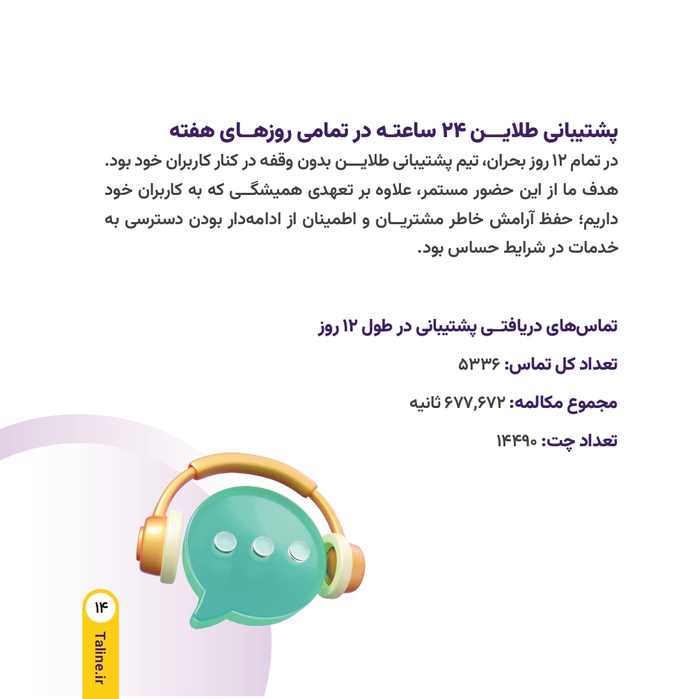 در میانه روزهای جنگ ۱۲ روزه علیه کشور عزیزمان ایران که بسیاری از فعالیتهای اقتصادی با اختلال، کندی یا توقف مواجه شده بود، ما در طلاین تنها یک هدف را دنبال کردیم. هدف ما حفظ ثبات، اعتماد و ادامه خدمات بدون وقفه به شما عزیزان بود. در واقع در همین شرایط بحرانی بود که احساس کردیم باید نقش پررنگ تعهد را بیش از پیش به مشتریان خود نشان دهیم. از همین رو در ادامه گزارشی جامع از روند فعالیت مجموعه در طی دوران جنگ را میتوانید بخوانید.
